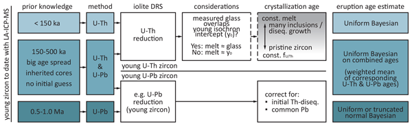 To improve U-Th zircon dating, we optimized a U-Th-Pb double-dating strategy for young zircon (150–300 ka). We found that the overall U-Th age spectrum is consistent whether assuming a constant melt composition or constant U/Th fractionation between zircon and melt, but testing the representability of the measured glass with the youngest isochron intercept proved essential. A Bayesian model with a uniform prior distribution gave the most accurate estimates of eruption timing for U-Th datasets.