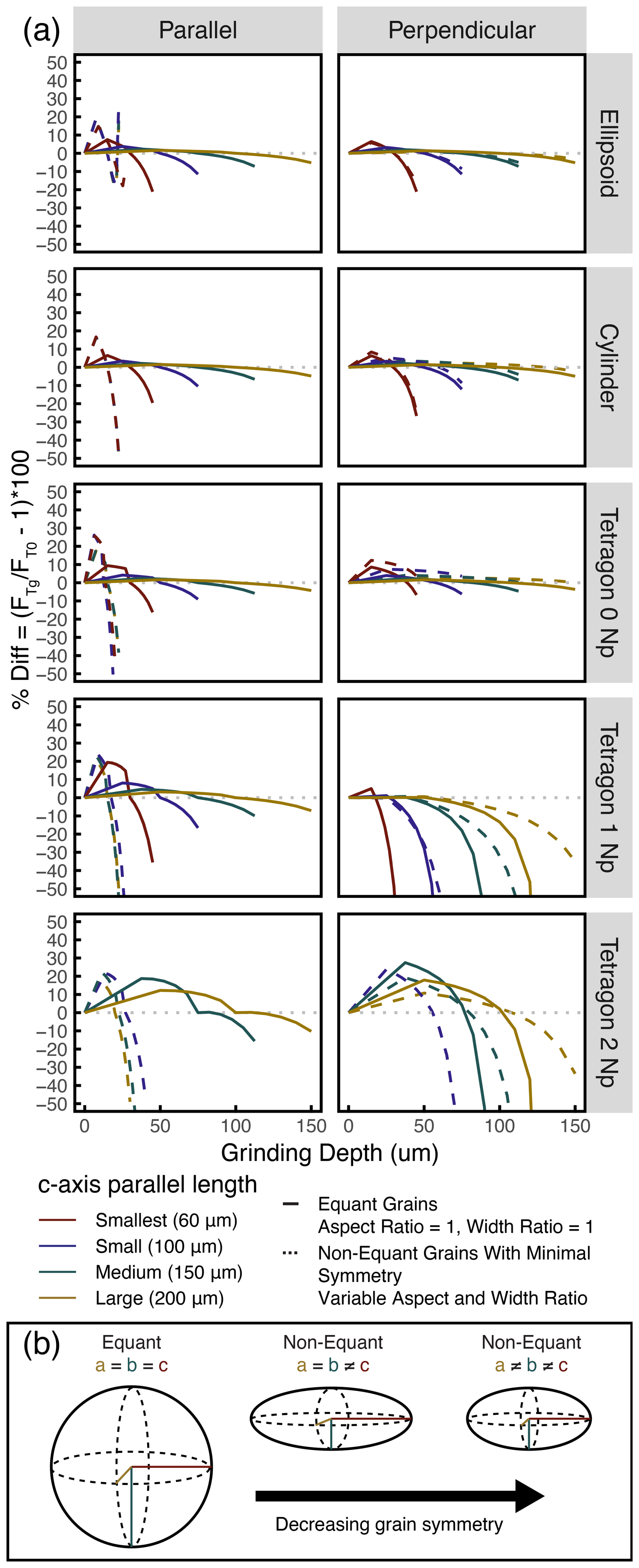 Figure 2(a) Percent difference between combined FT for ground/polished zircon and whole zircon as a function of grinding depth. Color corresponds to c-axis parallel length. Solid lines show patterns for largest equant grains in each size group (aspect ratio = 1, width ratio = 1). Dashed lines show patterns for smallest non-equant grains in each size group with minimum symmetry that meet requirements for whole-grain FT≥0.5. (b) Cartoon showing variability possible between equant and non-equant grains.