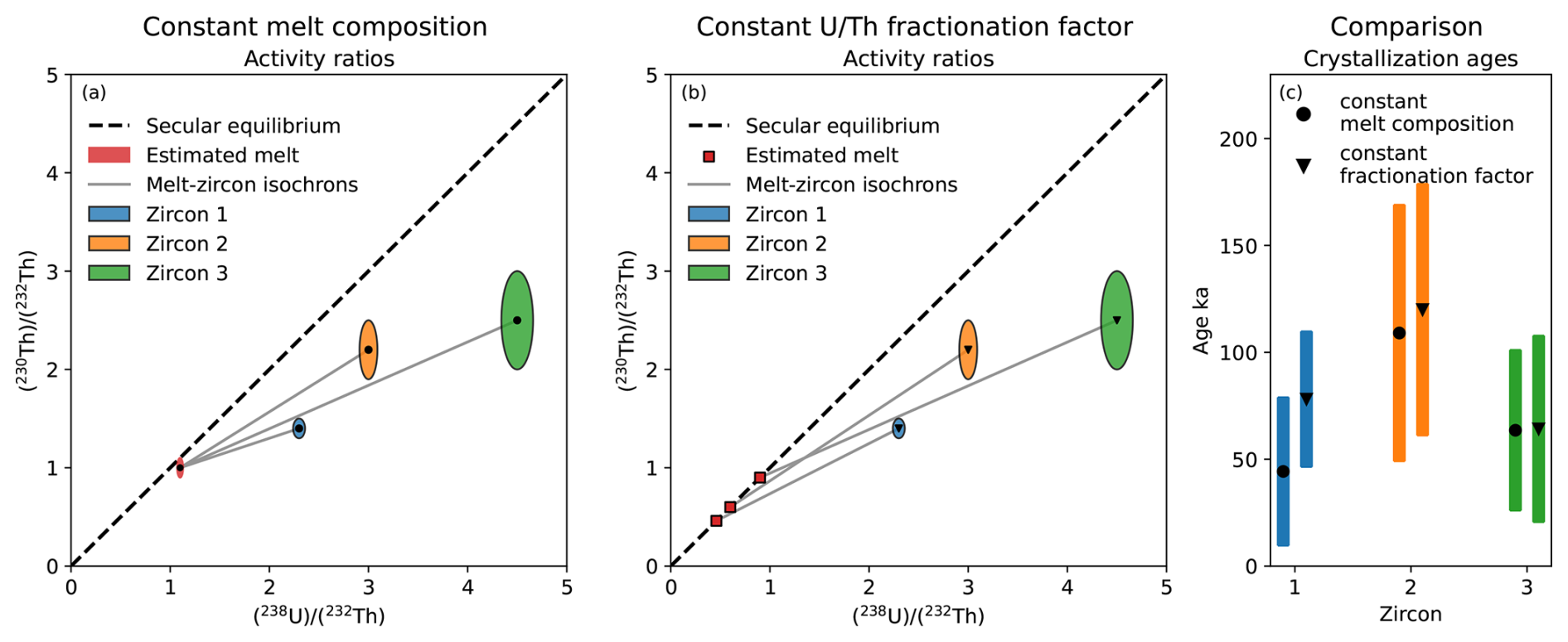 The most widely used geochronological techniques for zircon are U-Pb dating, applicable to crystals older than ∼ 100 ka (Sakata, 2018), and 238U-230Th disequilibrium dating (hereafter simply U-Th), which is suitable for ages younger than ∼ 380 ka (Schmitt, 2011). U-Th disequilibrium dating has gained prominence in recent decades (Reid et al., 1997; Coombs and Vazquez, 2014; Locher et al., 2025), yet a debated aspect of U-Th disequilibrium dating of zircon is how to best determine crystallization ages. To calculate these ages, each zircon analysis, reported as ratios of isotopic activities expressed using parantheses (230Th) (232Th) and (238U) (232Th) (Reid et al., 1997), needs to be linked to the melt from which it crystallized to form a two-point zircon-melt isochron. As each zircon model age depends on the melt composition, it is important to estimate this value carefully. Two contrasting ideas dominate as to how the U-Th zircon-melt pair can be approximated (Fig. 1): One idea assumes that a constant melt composition in terms of (230Th) (232Th) and (238U) (232Th), hereafter referred to as the melt anchor point, can be linked to the individual zircon activity ratios (Schmitt, 2011). The other idea suggests constant fractionation of U and Th between zircon and melt (Boehnke et al., 2016), where the melt signature is estimated from the zircon composition itself through a constant U Th fractionation factor (, Eq. 1). Choosing between these two approaches can have implications for interpreting crystallization histories of volcanic samples.