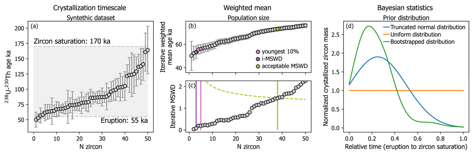The “i-MSWD” weighted mean method also performed unsatisfactorily. At low Nzircon, the “i-MSWD” tends to overestimate the eruption age, while for high Nzircon, it tends to underestimate it. This effect is linked to the relative size of the selected youngest zircon population. With fewer zircons, the proportion of zircon to cause a detectable MSWD jump must be larger, skewing the age estimate older. Conversely, with larger datasets, smaller proportions or ages suffice, often biasing the estimate to younger ages. In the specific case of our synthetic dataset, no distinct young population was implemented, but rather continuous crystallization, similar to what can be resolved in natural datasets for U-Th data. Given the high uncertainties of typical U-Th LA-ICP-MS zircon ages, true young zircon populations are most likely overprinted by Gaussian noise and are unlikely to be resolved. In our synthetic data, any MSWD jumps are randomly generated by Gaussian noise and the given uncertainties and do not reflect underlying geological processes. These jumps are often driven by low uncertainty dates, not by the presence of distinct zircon age populations. Therefore, in the absence of a clear population structure visible in the age plot, visual jumps in the iteratively calculated MSWD are arbitrary and not significant, and influenced by analytical artifacts rather than true geological events. Because the selection is based on visually identified and often ambiguous MSWD changes, this method lacks the objectivity and reproducibility necessary for robust eruption age estimation, particularly in low-dispersed datasets.