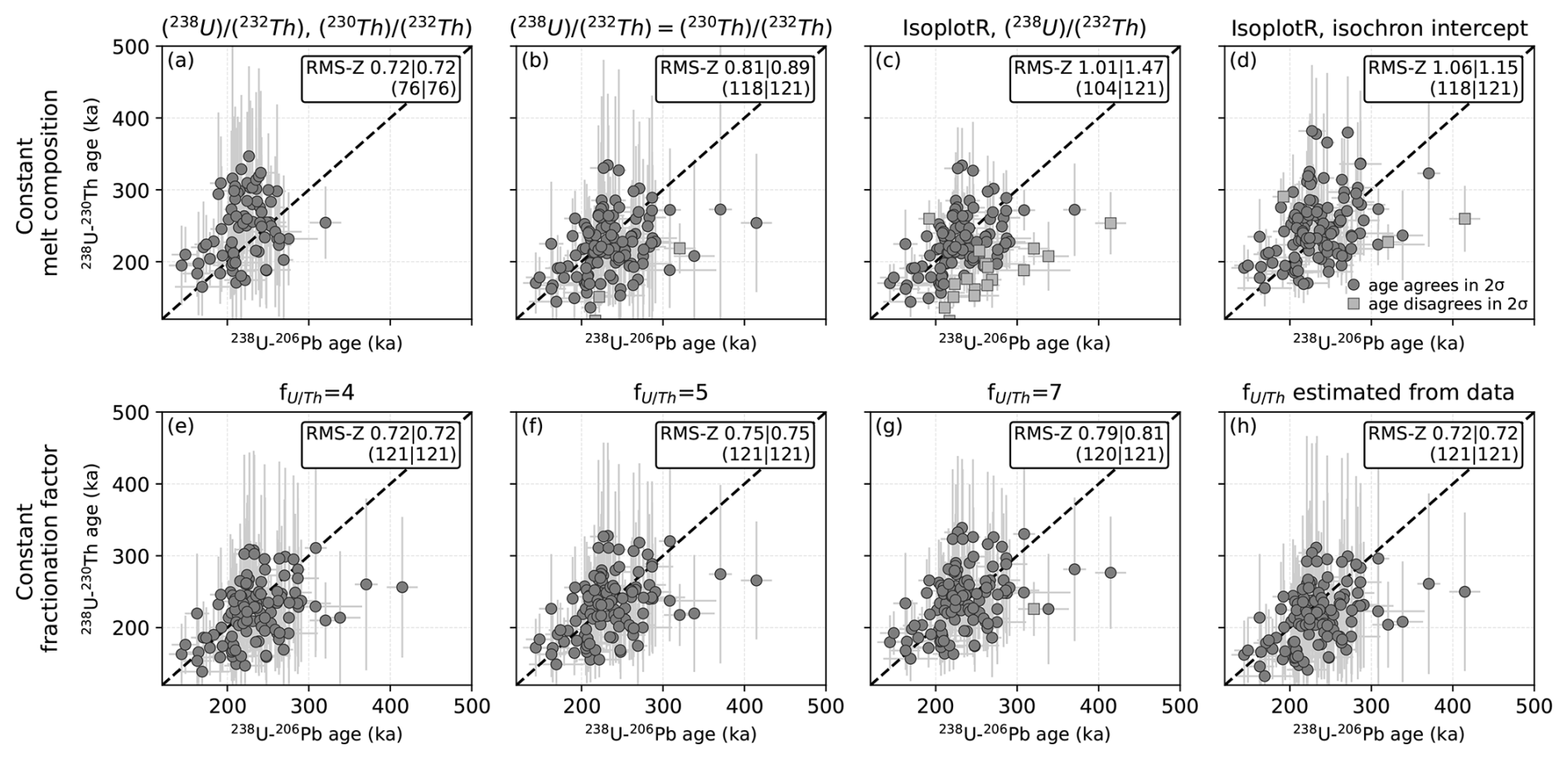Figure 4Comparison of KPT U-Pb and U-Th ages (1σ, including systematic uncertainties) from the same ablation volume using different U-Th age calculation approaches. Panels (a)–(d) show U-Th zircon crystallization ages calculated using a constant melt composition indicated by the title of each panel, while (e)–(h) use constant U Th zircon-melt fractionation factors . Dark grey points represent data where U-Th and U-Pb ages agree within 2σ; light grey squares indicate outliers with no overlap. Each panel shows the root mean square of the age differences normalized by the combined uncertainties of both datasets (RMS-Z) for the overlapping and total age datasets, along with the number of points considered (overlapping | total). RMS-Z values ≥ 1 indicate decreasing agreement between the U-Th and U-Pb age estimates.