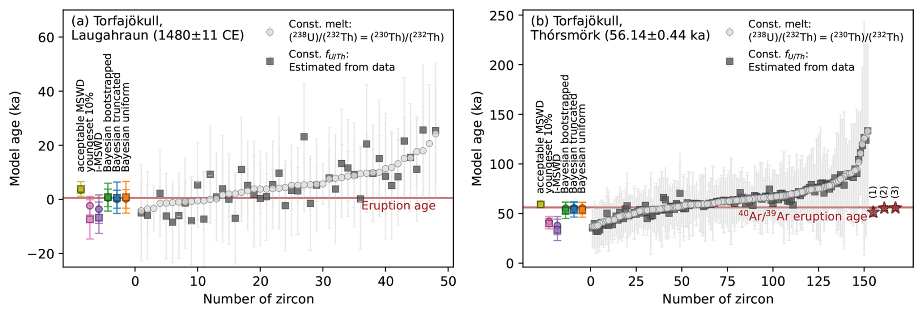 Figure 7Zircon crystallization and eruption age estimates for two validation samples from the Torfajökull volcanic system, Iceland (all uncertainties correspond to 2σ, eruption estimates additionally include a systematic uncertainty of 2.9 %). (a–b) Zircon crystallization ages (grey symbols) and eruption age estimates (colored symbols) for two samples from Torfajökull, with the marker shape corresponding to the different model age datasets. The first three estimates represent weighted mean ages calculated from different subsets of zircon ages, whereas the remaining three are Bayesian eruption estimates based on different prior distributions. Measurements of enhanced Th, implying apatite inclusions were ablated along with the zircon, were only used to calculate model ages with the constant melt approach. Shown alongside are suggested eruption ages for Laugahraun based on tephrochronology (Larsen, 1984) and the most recently published 40Ar 39Ar age of glassy fiamme from the Thórsmörk ignimbrite (Groen and Storey, 2022). The stars on the right of (b) correspond to independent eruption age estimates for Thórsmörk: (1) Moles et al. (2019), (2) Svensson et al. (2008), (3) Guillou et al. (2019).