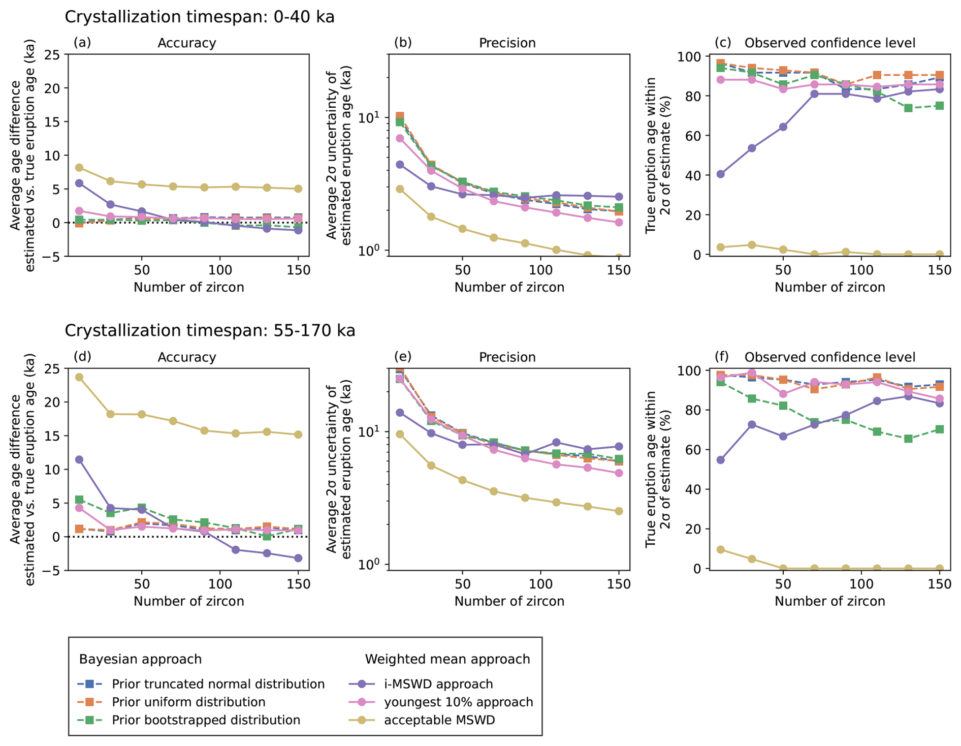 By comparing these parameters across different methods, several interesting observations can be made for the two age ranges we simulated (0–40 and 55–170 ka) and as a function of Nzircon (10, 30, 50, 70, 90, 110, 130, 150). The accuracy of the eruption age estimates generally increases with Nzircon. However, for the “acceptable MSWD” weighted mean the accuracy stagnates at a comparable high deviation from the true eruption age, while the “i-MSWD” weighted mean typically overestimates the eruption age for low Nzircon while underestimating it for high Nzircon. The best and most consistent accuracy is achieved by the Bayesian method with the truncated normal or the uniform prior distribution, shortly followed by the bootstrapped prior distribution and the “youngest 10 %” weighted mean method. As expected, the accuracy and the precision of all eruption age estimates are better for the young eruption ages than for the older ones, due to lower uncertainties of the underlying data. The precision increases for increasing Nzircon for all methods, except for the “i-MSWD” method, which plateaus at a lower Nzircon. The weighted mean methods tend to underestimate the uncertainty, yielding poorer confidence in the eruption ages. This is most significant for the “acceptable MSWD” weighted mean, as it only captures about 2 % of the eruption ages, while the “i-MSWD” weighted mean retrieves the eruption age in 73 % of the cases. Best and most consistent performance of the weighted mean methods across the range of Nzircon was yielded by the 10 % youngest zircon with a confidence of 89 %. Generally, Bayesian methods tend to capture the uncertainty more adequately. The prior uniform distribution and the truncated normal distribution perform best and most steadily with high levels of observed confidence of averaging 93 % and 92 % respectively, while the bootstrapped prior distribution only retrieved 81 % of the eruption ages. There is no significant difference in the performance of the truncated normal or uniform prior distribution in the Bayesian method as a function of the underlying sampled distribution, which would suggest any bias in favor of the tested prior distributions compared to the weighted mean method.