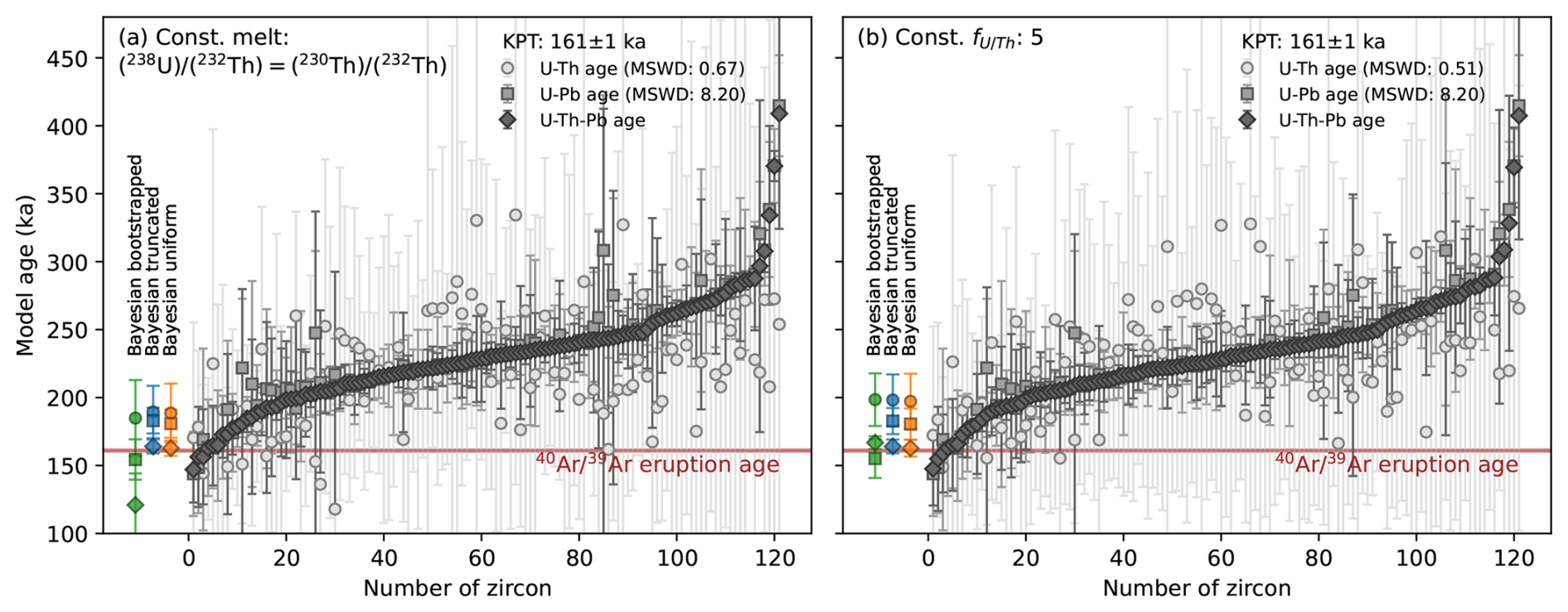 As zircon crystals from single volcanic eruptions typically exhibit dispersed U-Th or U-Pb dates (over kyr), protracted crystallization in the underlying magmatic system is dated and not the eruption itself. To directly date the eruption, alternative chronometers such as zircon (U-Th) He thermochronology, 40Ar 39Ar dating or radiocarbon dating can be employed. (1) Zircon (U-Th) He thermochronology records the time of cooling below the closure temperature of He of ∼ 200 °C (Reiners et al., 2002), which often corresponds closely to the eruption age (e.g., Friedrichs et al., 2020). This dating technique comes however with many challenges, including the need for corrections related to initial 230Th-238U disequilibrium, alpha-ejection effects, pre-eruptive residence time, and accounting for internal age and compositional heterogeneity (Friedrichs et al., 2020). (2) 40Ar 39Ar dating is widely used on potassium-rich minerals or volcanic glass (e.g., Smith et al., 1996; Groen and Storey, 2022; Castellanos Melendez et al., 2023). This technique typically records the time when argon becomes trapped within the mineral or glass, which is commonly assumed to coincide with eruption (Kelley, 2002a). However, the presence of excess or inherited argon, as well as post-eruption alteration, can bias the resulting ages, complicating their interpretation (Kelley, 2002b; Ellis et al., 2017). (3) Radiocarbon dating of organic material buried or killed by volcanic deposits provides another means of constraining the timing of eruption (e.g., Friedrich et al., 2006; Danišík et al., 2020). Its applicability is limited to ages younger than ∼ 55 ka (Hajdas et al., 2021), and it requires the presence of suitable organic horizons directly beneath volcanic deposits, conditions that may be difficult to meet when attempting extensive and comparable dating across a volcanic system. Alternatively, we can infer the eruption age from the latest zircon crystallization, if we assume that zircon crystallized until the eruption took place (Keller et al., 2018; Nathwani et al., 2025). Protracted zircon crystallization, often reflected in a broad spread of non-overlapping dates within a single sample (Bachmann et al., 2007b; Schaltegger et al., 2015; Klein and Eddy, 2024), renders weighted mean and isochron ages derived from all analyses unreliable for eruption age estimation. In contrast, the youngest zircon age generally lacks statistical robustness (Keller et al., 2018). Consequently, alternative methods have been applied to estimate the eruption timing, including a weighted mean of a subset of zircon ages (e.g., Schoene et al., 2015; Locher et al., 2025) and likelihood-based Bayesian methods (e.g., Baudry et al., 2024; Cisneros de León et al., 2025). Keller et al. (2018) pioneered the application of Bayesian statistics for eruption age estimation from a distribution of zircon U-Pb ages. They found that this method produces superior accuracy and estimates of uncertainty relative to the weighted mean or youngest zircon methods. However, their study focused on ID-TIMS U-Pb data using synthetic datasets in which all ages were assigned the same uncertainty, a scenario more applicable to U-Pb than to U-Th datasets. In U-Th disequilibrium dating, uncertainties increase for older ages due to the exponential convergence toward secular equilibrium, making the zircon-melt isochron age increasingly sensitive to analytical uncertainties in the activity ratios (Schmitt, 2011). Despite the growing number of studies using U-Th zircon data, a range of eruption age estimation methods are currently employed without a systematic evaluation of which method yields the most reliable results.