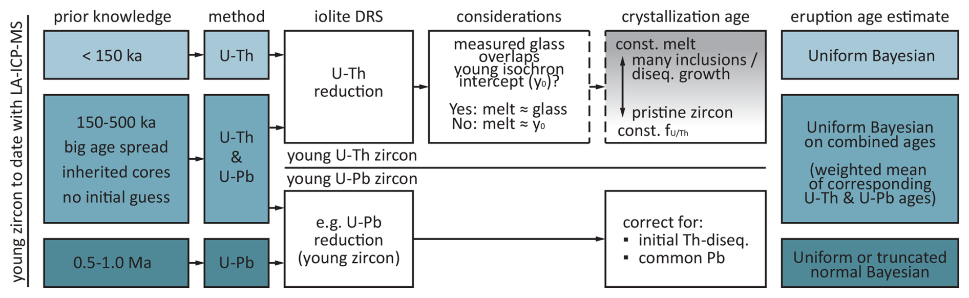 Figure 10Proposed workflow to date young zircon (< 1 Ma) and outline of the applicability of the here presented optimized U-Th-Pb double-dating strategy. The time ranges for different dating strategies are specified, along with the custom iolite DRS that can be applied. The favorable approaches of determining individual zircon crystallization ages are described, including the crucial assessment of whether the measured groundmass glass activity ratio composition overlaps with the young isochron intercept to evaluate the reliability of the groundmass glass measurement. Finally, the recommended method for estimating the eruption age is provided.