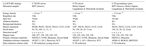 Table 1LA-ICP-MS strategies for the three measurement routines applied in this study. The U-Th-Pb routine was used only for the KPT sample, whereas the typical U-Th routine was applied to the validation samples Heisei (Japan) and Laugahraun and Thórsmörk (Iceland). Groundmass glass was analyzed for all four samples. The main differences between the U-Th-Pb and U-Th routines are the measured masses, magnet positions, and dwell times, the latter influencing the precision and detectability of low-count isotopes. More technical details can be found in the Excel file stored in the open-source Zenodo repository (Moser, 2025).